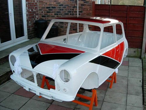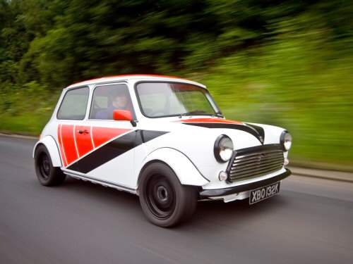 This mini started as a design concept based on the 1980 Scalextric Mini Clubman Slot Car Model, we had wondered whether the striking design of the Scalextric 1275 GT could be used on the traditional mini front. Drawings and design ideas were produced and from these the real full size item could start to come to life. As the design is based on white, red and black, we decided to incorporate these colours into other aspects of the car such as suspension, the engine bay and the interior. The car, although styled, was to have a relatively minimalist finish by hiding away extras such as the stereo system and wiring loom to give a smoother hot rod type look.A new bodyshell with doors, bootlid and bonnet were purchased along with the 1000's of other associated parts to build the car into better than new condition. The mini was dry built to ensure everything fitted so that the build up, when painted, would be exact. It is important to try everything, but it was at this stage that we needed to decide which wheels and tyres to use, as getting the clearances right so that they don't rub in use is critical. We chose Compomotive Bavarian Wheels in black with 175/50/13 tyres with a slick type profile, perfect for Scalextric! We decided to cut the front arches and also tub the rear wheelarches for more clearance. Curley Miglia type wheelarches were used to cover and were an excellent match for the model. Paintwork was carried out by our paintshop with the white being laid down first followed by the distinctive red and black design, a task not for the faint-hearted! Finally, when dry the clear coat was added for a fantastic shine.